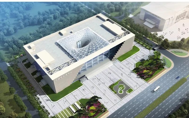 2.技術(shù)難點(diǎn):本項(xiàng)目功能綜合,根據(jù)不同功能區(qū)人員密集程度不同,設(shè)計(jì)不同的快捷疏散通道,同時(shí)能體現(xiàn)出八大展廳功能布置的合理及規(guī)范。外立面系部圓弧采用條型金屬板實(shí)現(xiàn),使轉(zhuǎn)角過度更加平滑;入口處采用鋼結(jié)構(gòu)空間桁架滿足建筑大懸挑和造型的要求;躍層的大廳采用鋼結(jié)構(gòu)玻璃頂,使之更加開敞明亮。